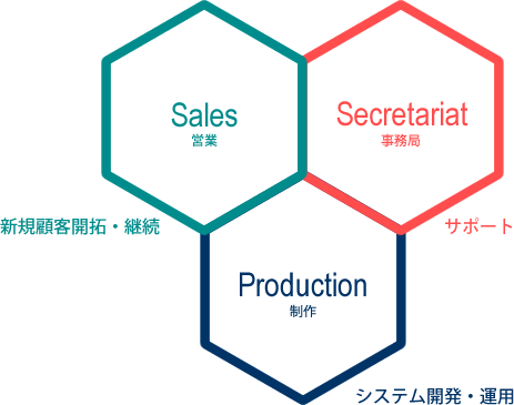 営業部が新規顧客開拓をし、事務局が企業やユーザーのサポートをします。制作部は、各Webサービスの開発と、建築業界のWeb回りの制作をお手伝いしております。